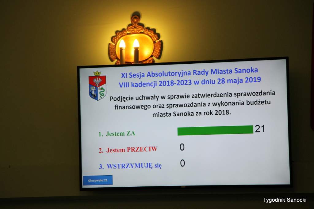 18 czerwca podczas XI Sesji Absolutoryjnej Rady Miasta Sanoka VIII kadencji rada jednogłośnie zadecydowała o udzieleniu wotum zaufania urzędującemu burmistrzowi. Po udzielonym mu wotum zaufania, burmistrz przedstawił Raport o Stanie Gminy Miasta Sanoka za rok 2018 oraz dokonał sprawozdania finansowego za ubiegły rok budżetowy. Wymienił najważniejsze inwestycje, takie jak dworzec multimodalny, Centrum Rehabilitacji i Sportu. Podczas sesji rada podjęła uchwałę w sprawie udzielenia Burmistrzowi Miasta Sanoka absolutorium z tytułu wykonania budżetu za 2018 rok. Głosowało 21 radnych. Wszyscy byli za udzieleniem absolutorium.