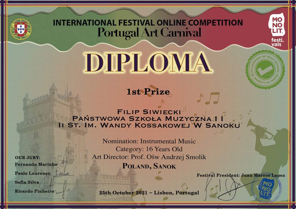I miejsce w Lizbonie zdobyli w kategoriach solowych Filip Siwiecki i Kacper Kosztyła. Z kolei w listopadzie obaj chłopcy uczestniczyli w International Competition and Festival of Arts „ Les etoiles de Paris 2021” również z pięknym sukcesem. Filip zdobył I miejsce i złoty medal, zaś Kacper II solo oraz również II w duecie z Filipem (również srebrne medale).Tak więc trwa znakomita tegoroczna passa znanego z wielu koncertów w regionie duetu, zapoczątkowana jeszcze przed festiwalem sanockim zdobyciem Grand Prix przez duet i Filipa oraz I miejsce przez Kacpra na Instrumental Art Competiton w Kazachstanie.