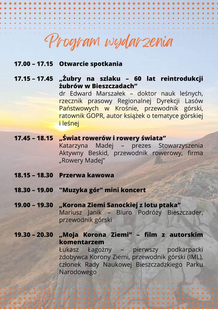 „ Nasi znamienici goście przedstawią prezentacje, filmy i slajdy o tematyce górskiej z naszym projektem KZS w tle. Będzie też akcent muzyczny. Jako wydarzenie towarzyszące odbędzie się koncert muzyki inspirowanej górami w wykonaniu znanych sanockich muzyków: Macieja Harny, Roberta Handermandera i Jacka Dusznika. Maciej to założyciel i lider legendarnej grupy – Orkiestry Jednej Góry „Matragona”, a to jeden ze szczytów KZS więc można się spodziewać pozytywnych akcentów.” – czytamy w zaproszeniu organizatorów projektu.