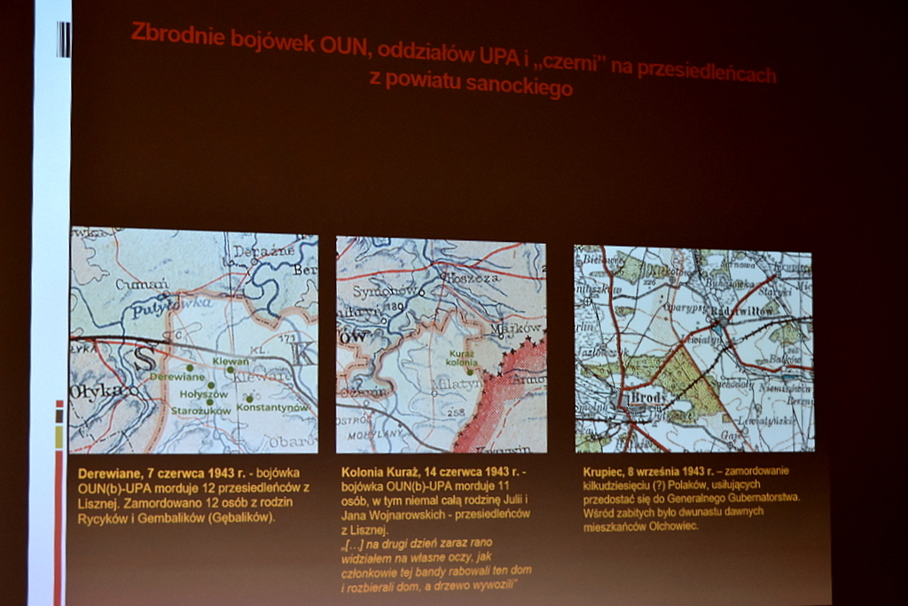 W pierwszej części dr Piotr Chmielowiec relacjonował działania ukraińskich nacjonalistów w odniesieniu do jednostek Wojska Polskiego na obszarze Pogórza Przemyskie i w Bieszczadach w okresie końcowym polskiej wojny obronnej w 1939 r. Następnie dr Tomasz Bereza przedstawił losy ludności z powiatu sanockiego, wpierw wysiedlonej przez sowietów na wschód (np. z Lisznej, Olchowiec, Wujskiego), a następnie wymordowanych przez Ukraińców na Wołyniu. Później Artur Brożyniak zrelacjonował zbrodnię dokonaną przez UPA w Baligrodzie w dzień 6 sierpnia 1944 r. tj. w święto Przemienienia Pańskiego.